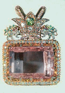 تاج مورد استفاده رضاخان و محمدرضا پهلوی. اين تاج از طلا و نقره ساخته شده و آراسته به الماس های برليان بسيار اعلاء، تخمه های درشت زمرد، ياقوت کبود ومرواريد است. کلاه تاج ابره مخمل قرمز است و در قبه آن که تخمه زمرد خياره در چنگ نشانده، قرار دارد.